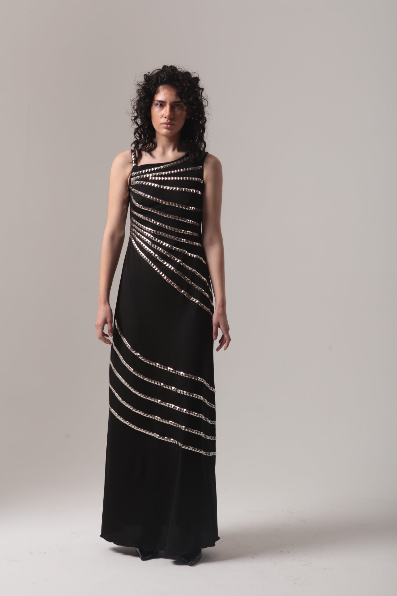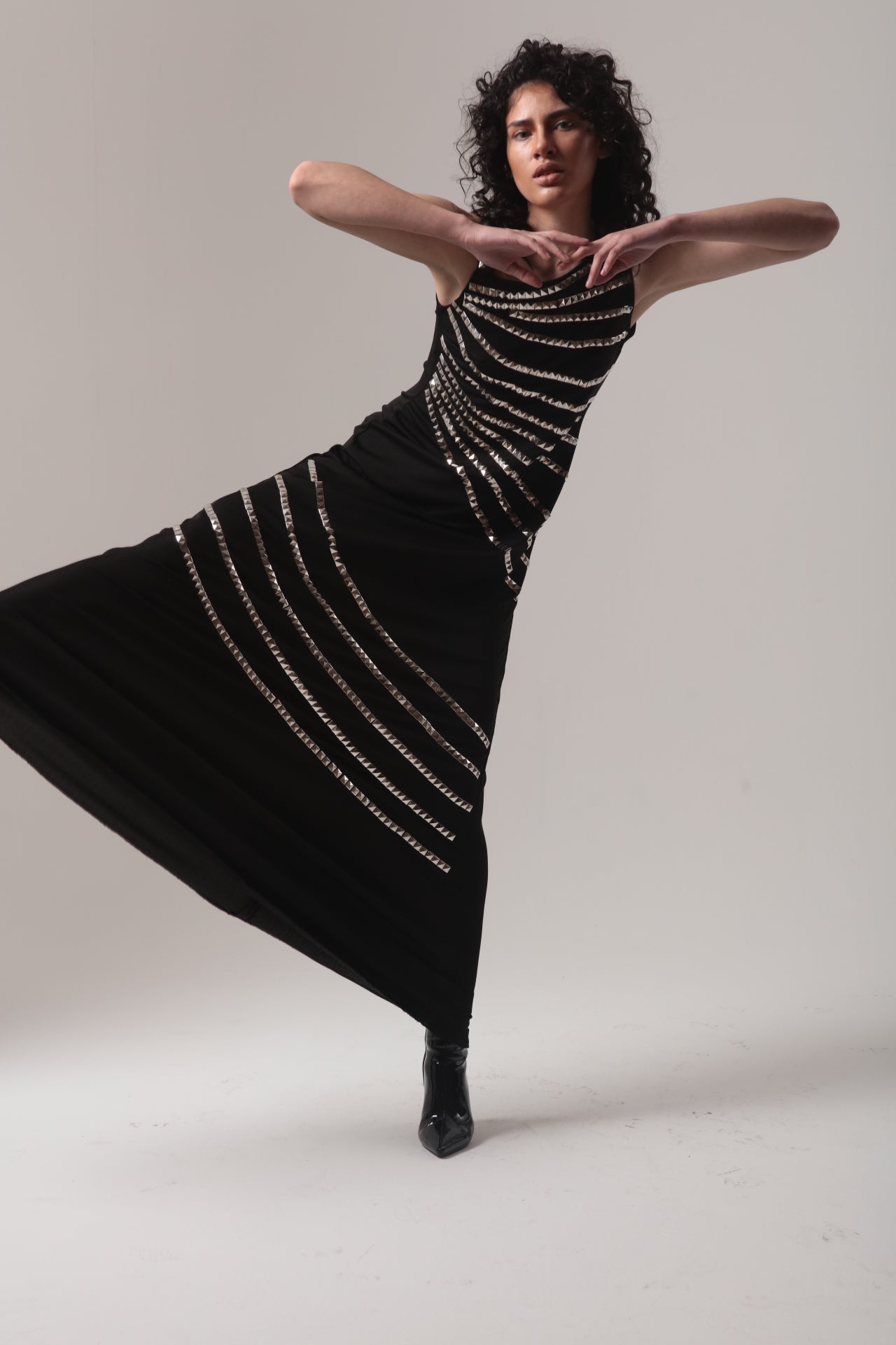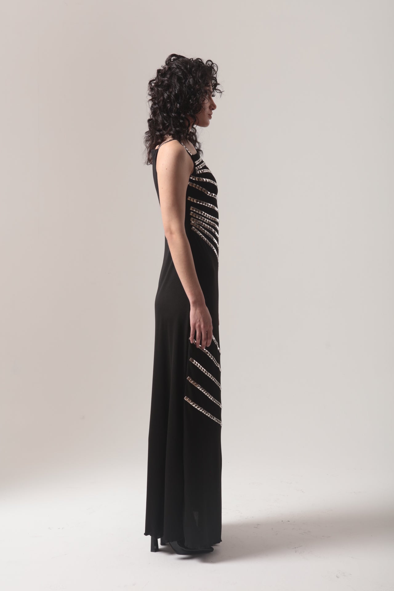 Abito evening con corpetto irregolare e monospalla in borchie in Jersey viscosa a costine e molto tempestato di borchie in maniera trasversale.