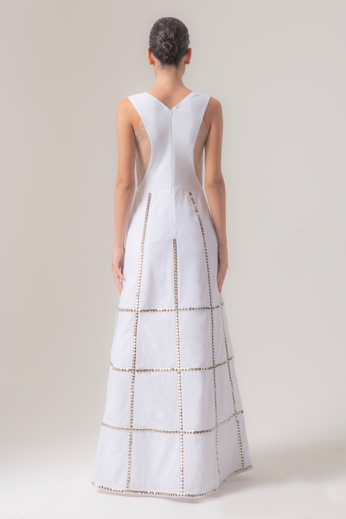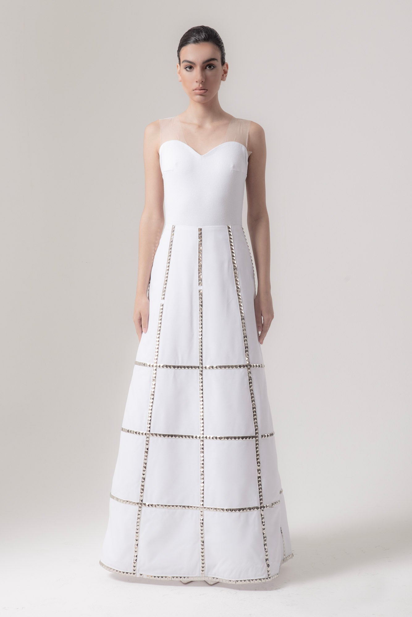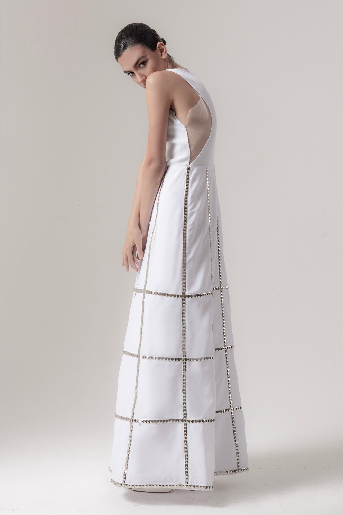 La gonna e' a quarto di ruota, in rasatello di cotone, borchiata.