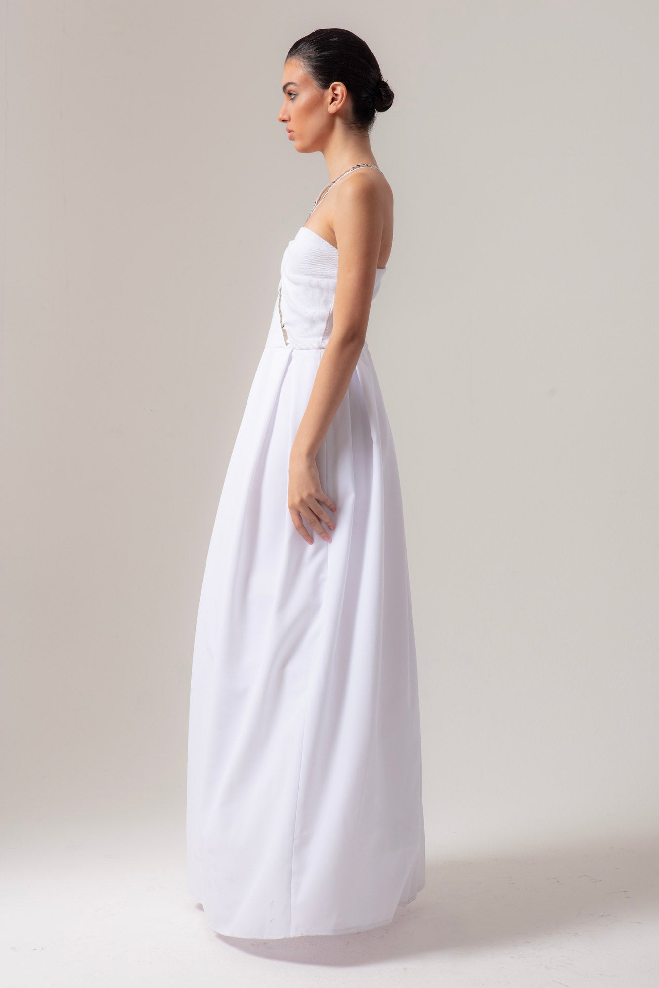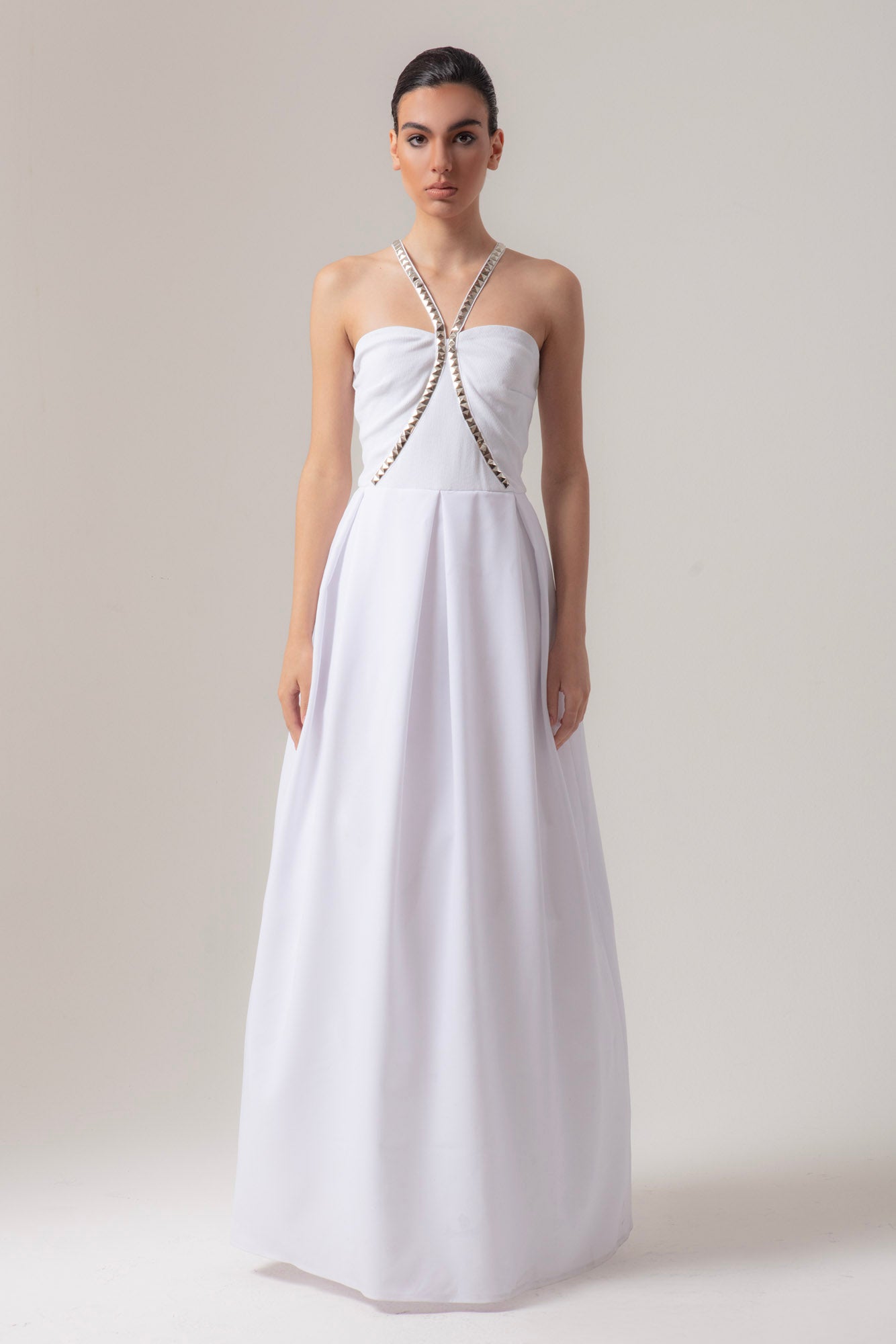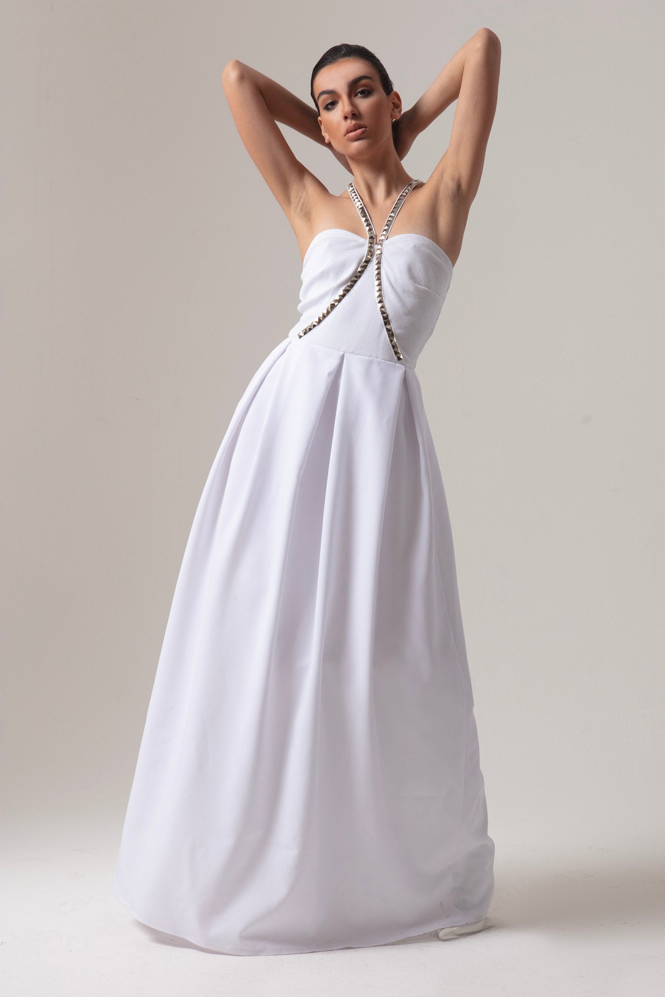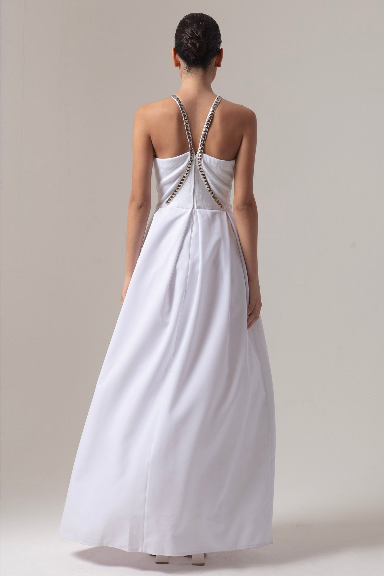 Abito evening e wedding con scollo americano in borchie a incrocio e corpetto in jersey viscosa a costine.