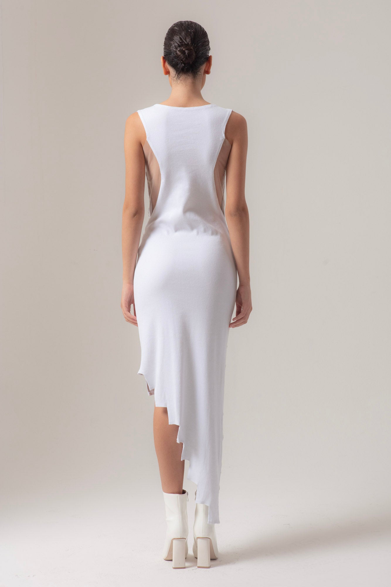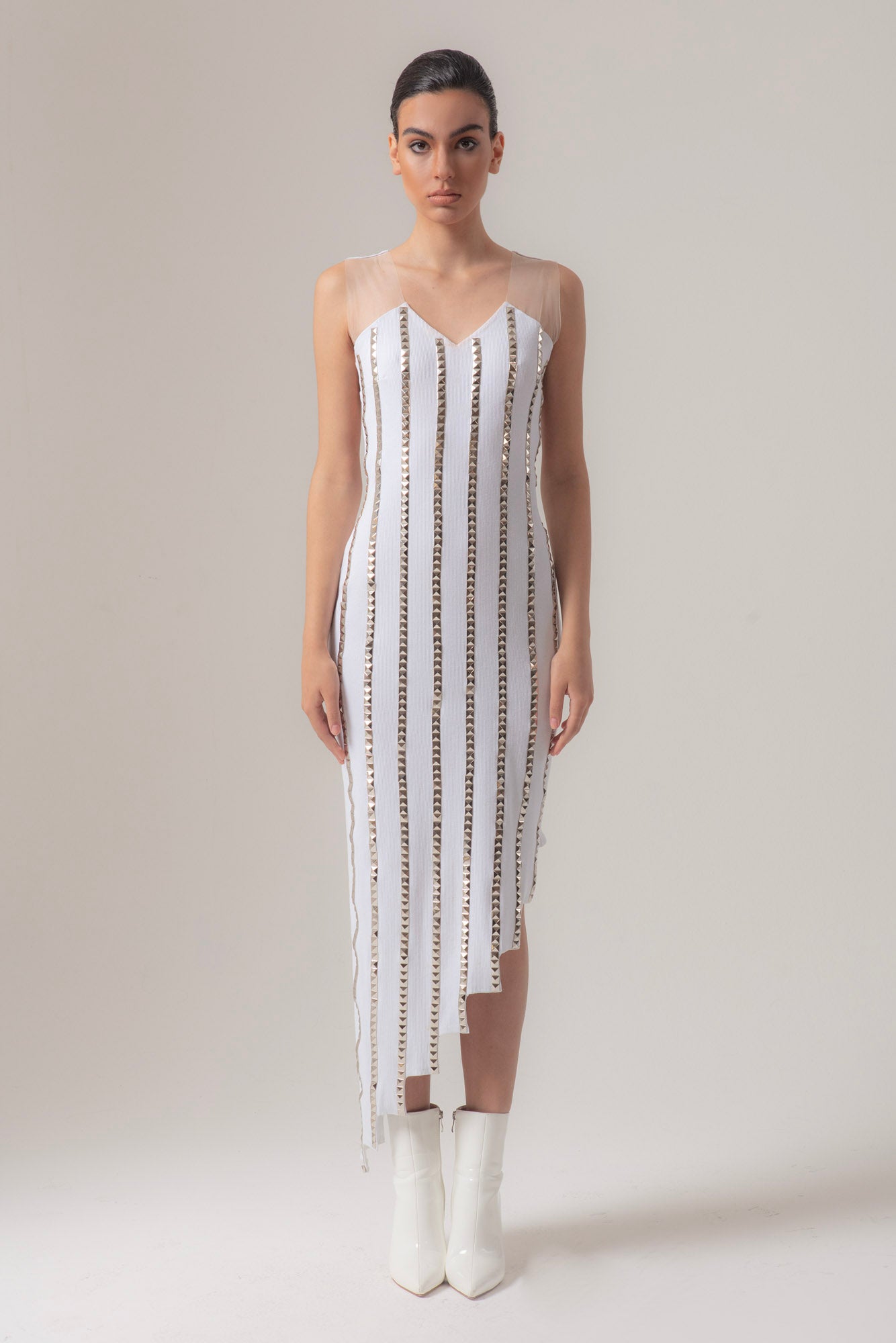 Abito semilungo irregolare evening con scollo a v e bretelle in tulle. Interamente in jersey viscosa a costine con applicazioni in borchie.