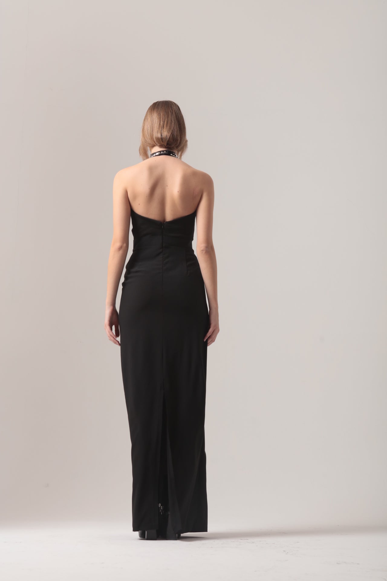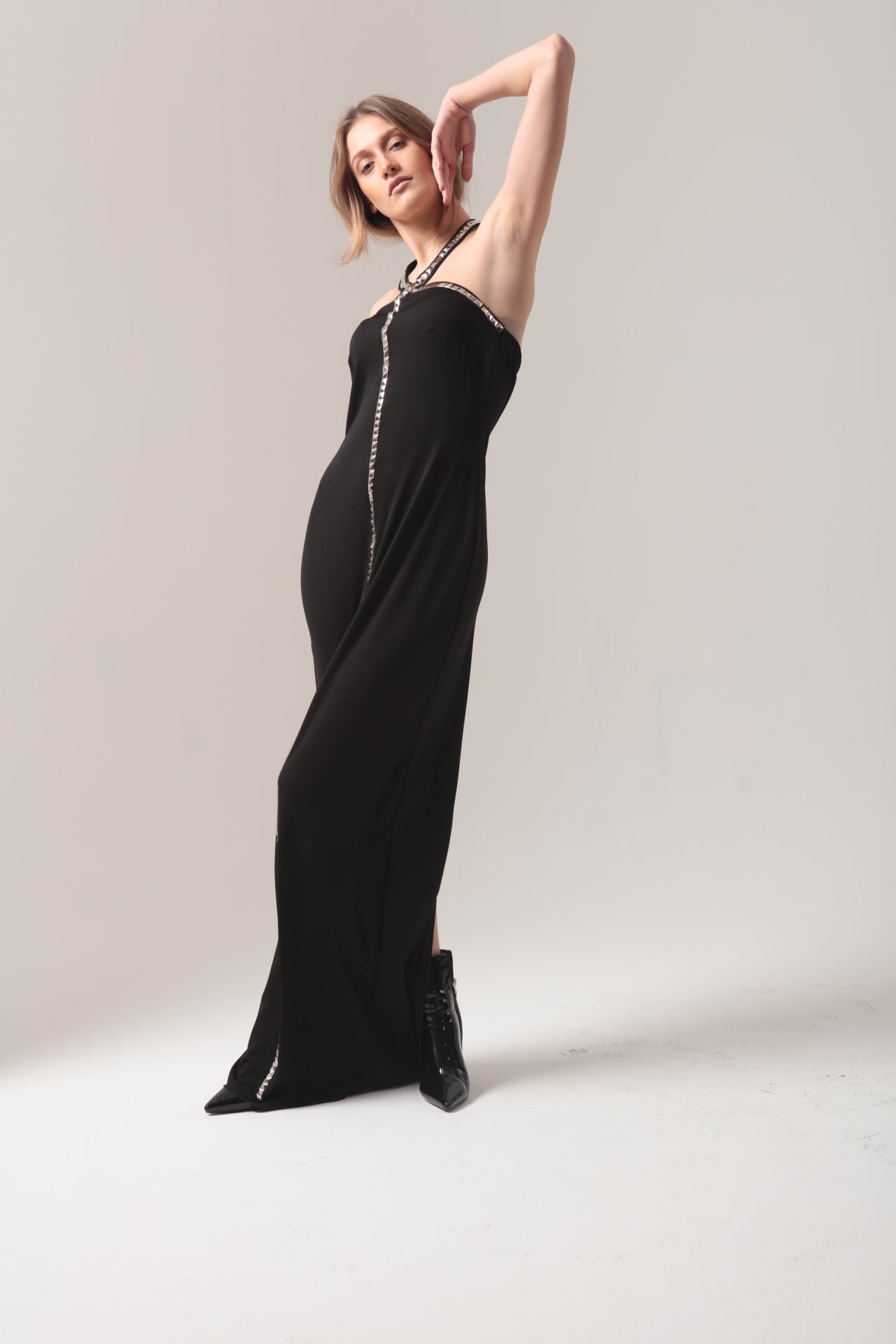 Abito evening con scollo a incrocio e linea dritta tempestati di borchie in jersey viscosa a costine.