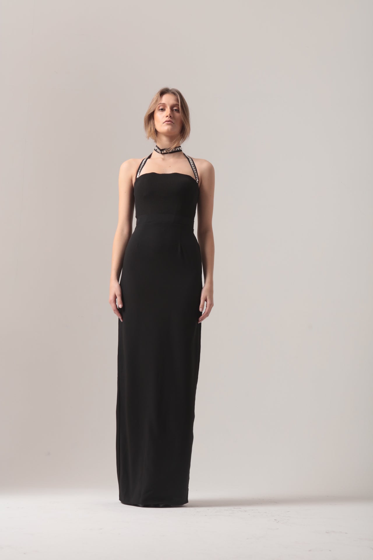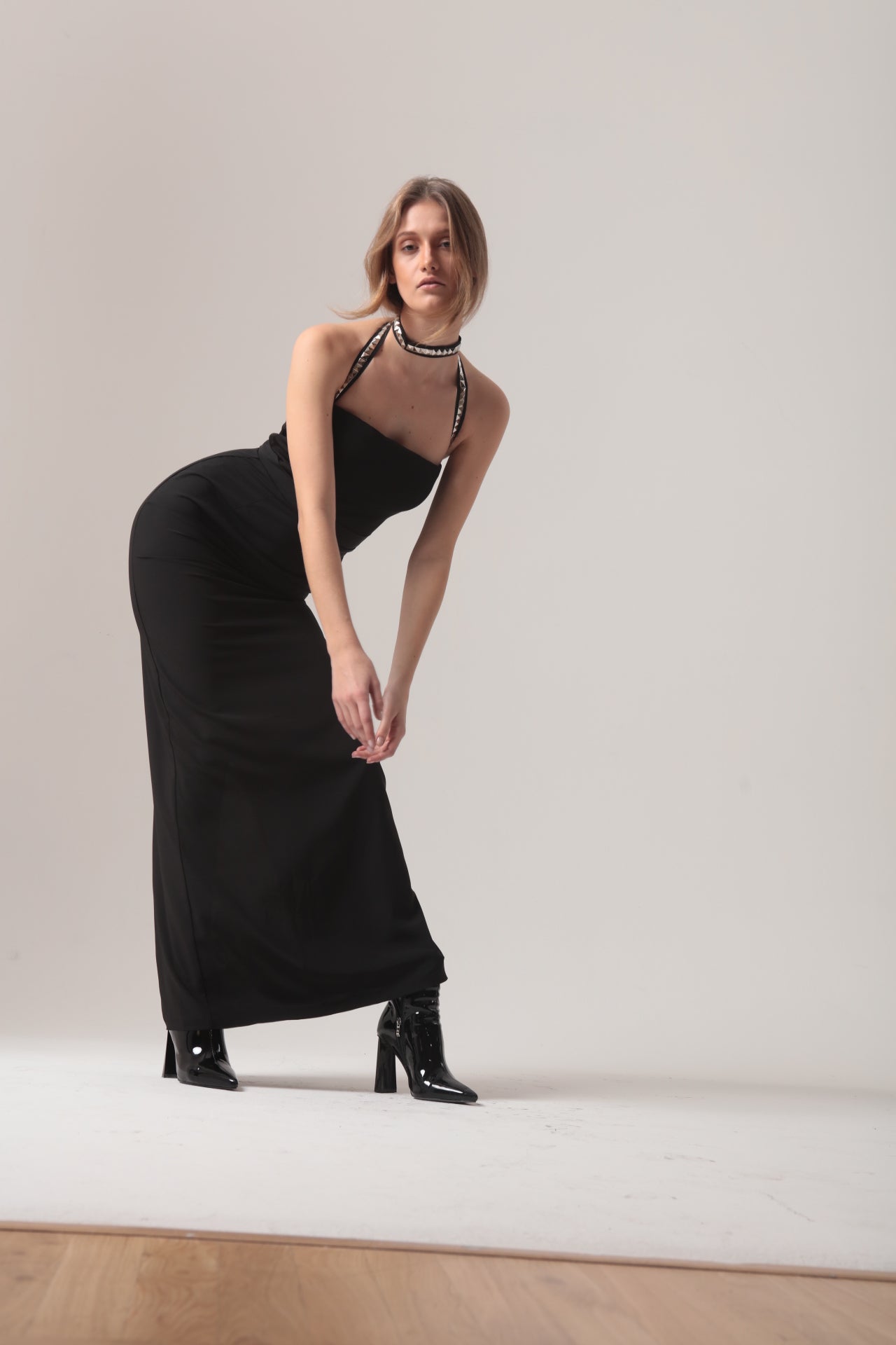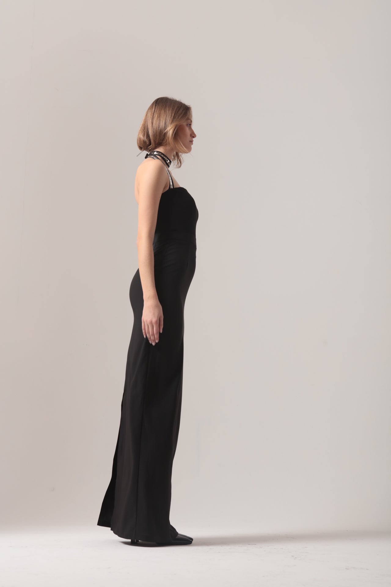 Abito evening con scollo dritto e spalline trasversali interamente borchiate in jersey viscosa a costine.